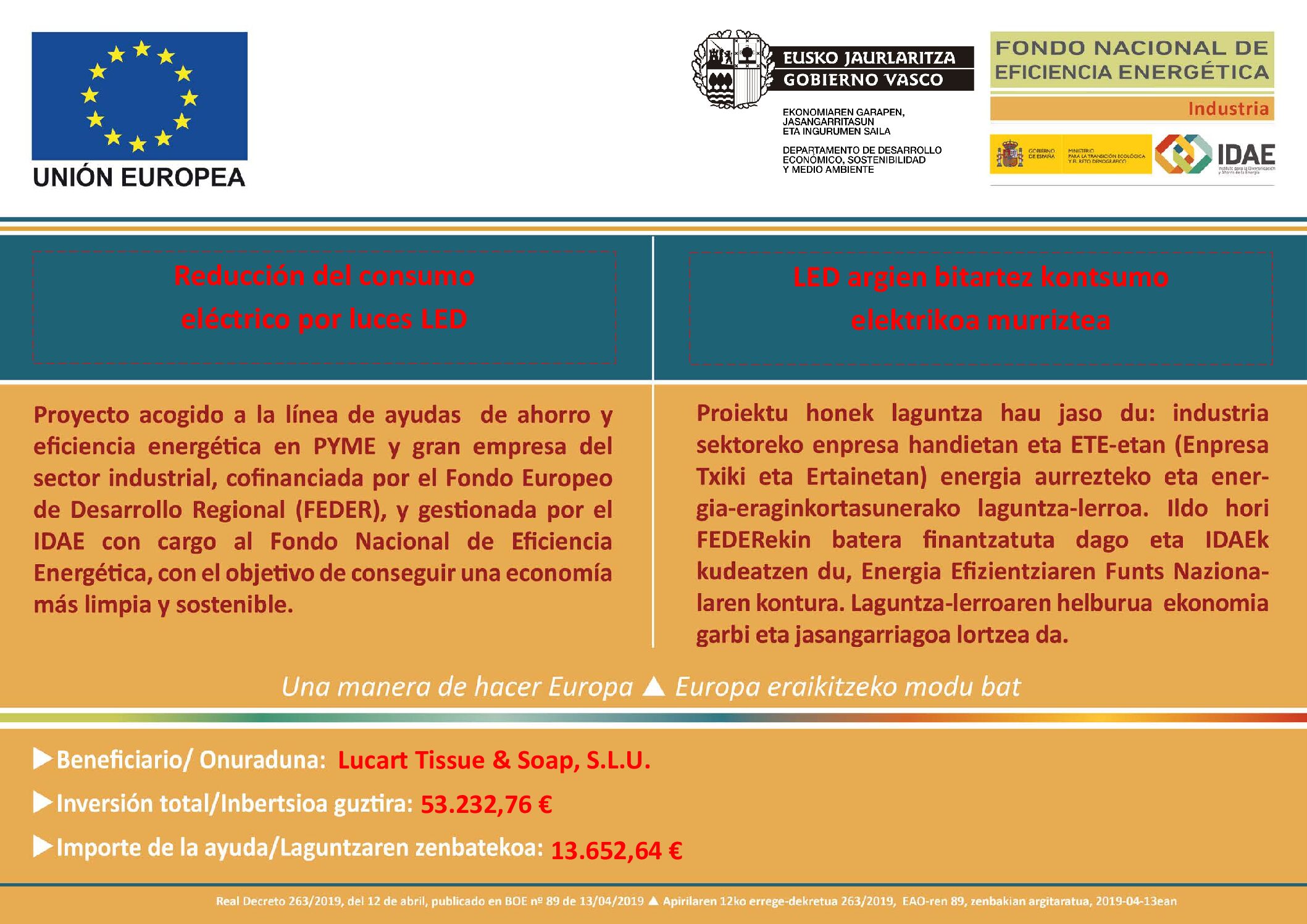 Este proyecto se ha adherido al departamento de economía, sostenibilidad y medio ambiente del Gobierno Vasco, a través de subvención directa a fondo perdido con fondos FEDER, con el objetivo de conseguir una reducción del consumo energético