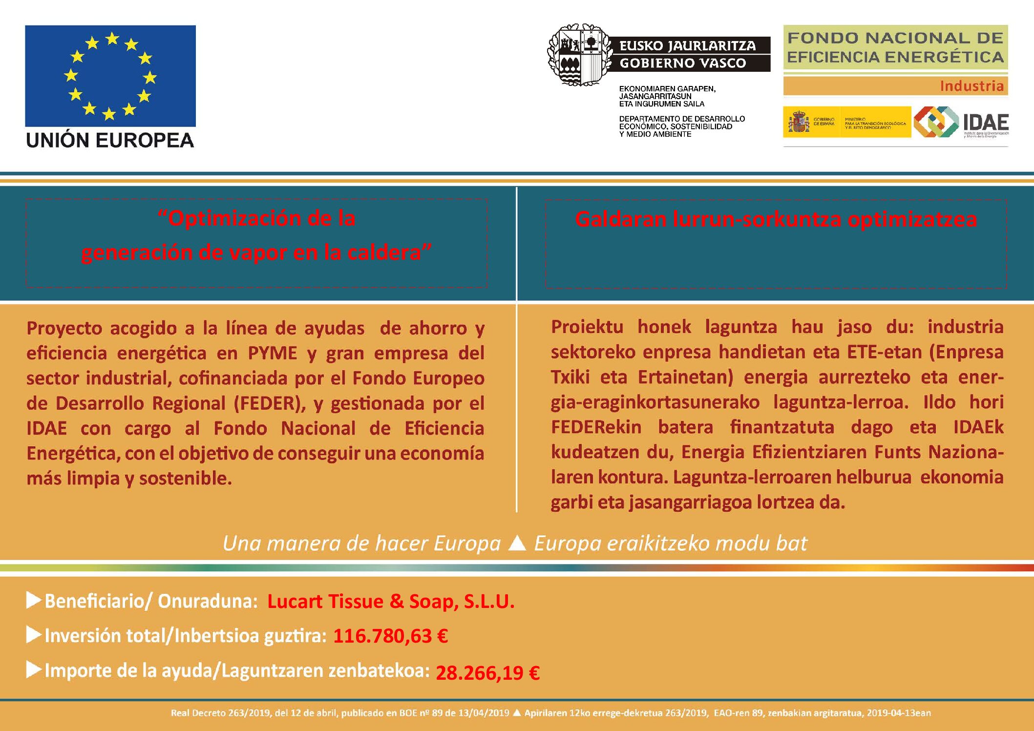 Con el objetivo de mejorar de forma constante en la eficiencia energética de los procesos productivos del Grupo Lucart, desde Lucart Tissue & Soap ha realizado mejoras en la generación de vapor en la caldera, evitando perdidas de energía y de fugas. Con los cambios pertinentes se pretender obtener un ahorro térmico en la generación de vapor.